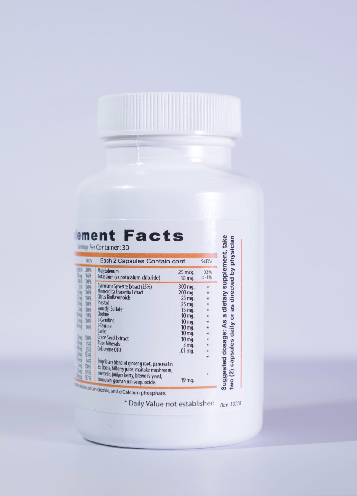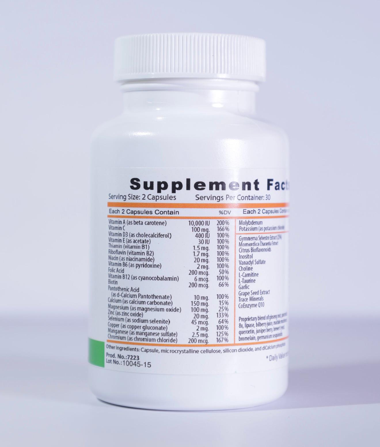 Ingredientes: cada 2 cápsulas contiene Vitamina A 10.000 u., Vitamina B1 (Tiamina) 1,5 mgr., Vitamina B2 (Riboflavina) 1,7 mgr., Vitamina B6 2 mgr., Vitamina B12 6 mcgr., Biotina 200 mcgr., Vitamina C 100 mgr., Vitamina E 30 u., Vitamina D 400 u., Pantotenato de Calcio 10 mgr., Calcio 150 mgr, Cromo 200 mcgr., Cobre 2 mgr., Magnesio 100 mgr., Manganeso 2,5 mgr., Molibdeno 25 mcgr., Selenio 45 mcgr., Sulfato de Vanadyl 15 mgr., Zinc 20mgr., Colina 10 mgr., L-Carnitina 10 mgr., Inositol 25 mgr., L- Taurina 10 mgr., Coenzima Q10 0,01 mgr., Bioflavonoides 25 mgr., Extractos de semillas de uva 10 mgr., Ajo 10 mgr., Extracto de Gymnema silvestre 300 mgr., Extracto de Momordica Chirantia 200 mgr., Aceite de pescado 5 mgr., Niacinamida 20 mgr., Ácido Folico 200 mcgr., Potasio 10 mgr., Micronutrientes 3 mgr., (mezcla propietaria de raíz de ginseng, mezcla de enzimas, arándano, hongo maitake, quercetina, levadura de cerveza, vaya de cedro, bromelaina y ger 132) 18 mgr.