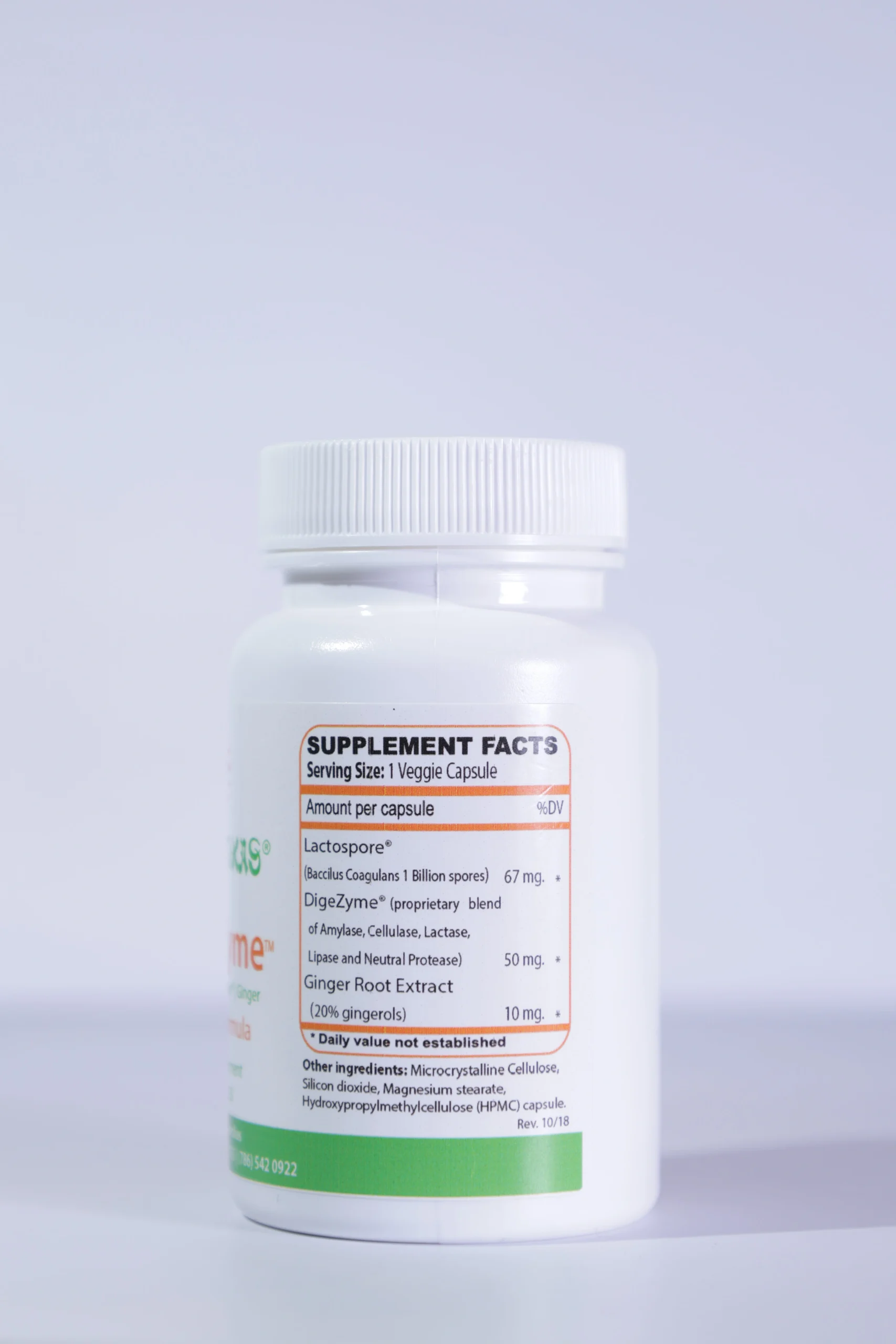 Ingredientes: cada cápsula contiene LactoSpore® 67 mgr. (aproximadamente mil millones de esporas por cápsula), DigeZyme® (una mezcla propietaria de Amilasa, Celulasa, Lactasa, Lipasa y Proteasa Neutra) 50 mgr., extracto de raíz de Gengibre (20% gingeroles) 10 mgr.