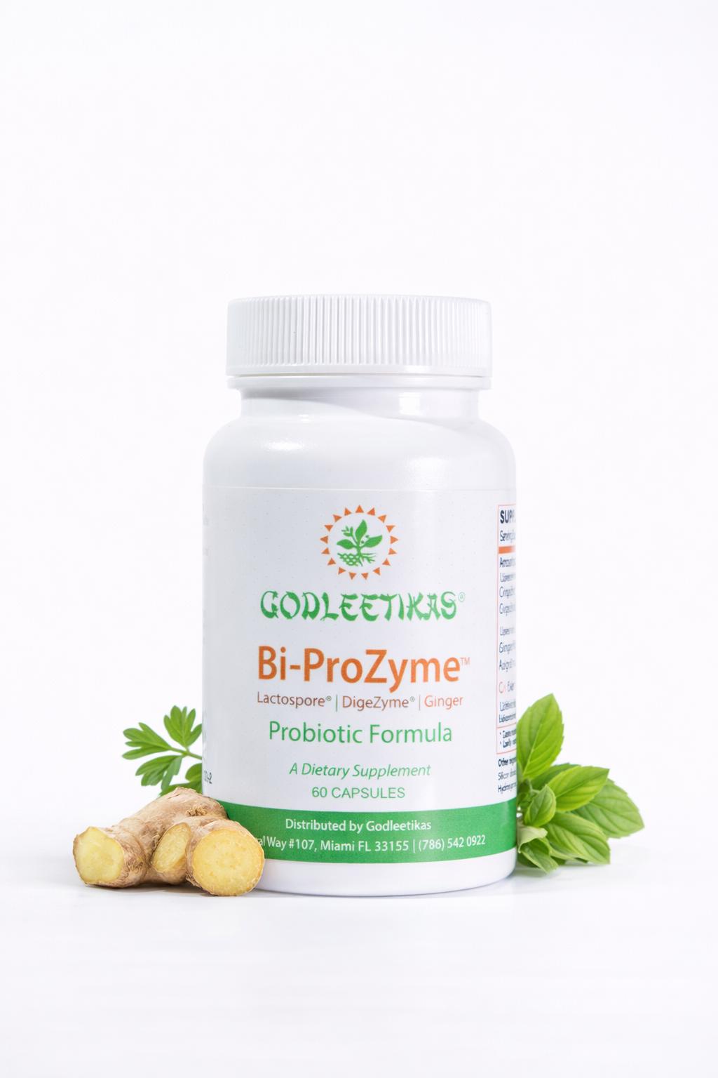 Bi- ProZyme™ es una combinación única del probiotico de temperatura ambiente LactoSpore®, una mezcla de encima digestiva (DigeZyme®) y extracto de raíz de gengibre. Esta combinación ha sido diseñada para mejorar la función digestiva, lo cual a su vez lleva a un cuepo y metabolismo en general más saludable.
